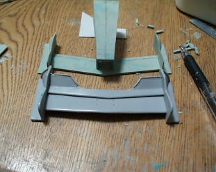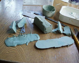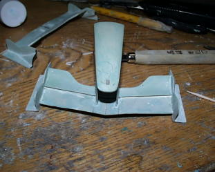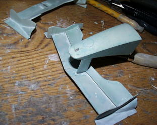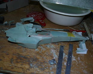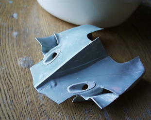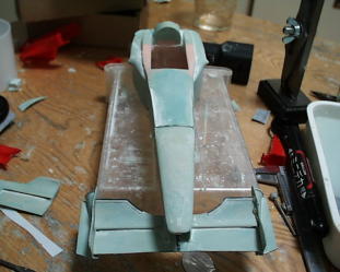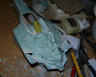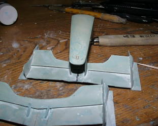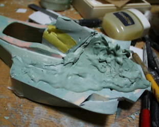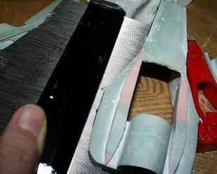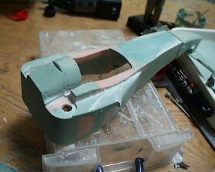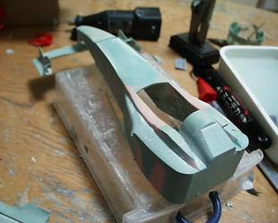 ラジエターアウトレットは写真撮って無かった。取り合えず背ビレの部分にポリパテを盛ります。ヴァセリン塗って剥がせるように。