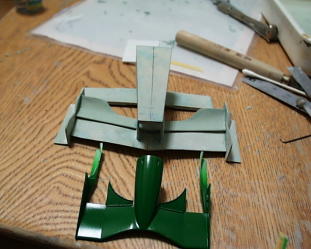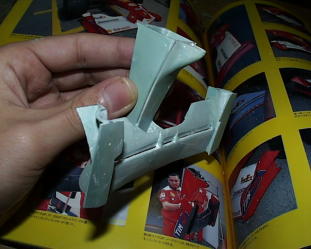 プラ板をテンプレートにしてノーズ下面をつくります。左はMGのF399との比較。小さすぎ・・・